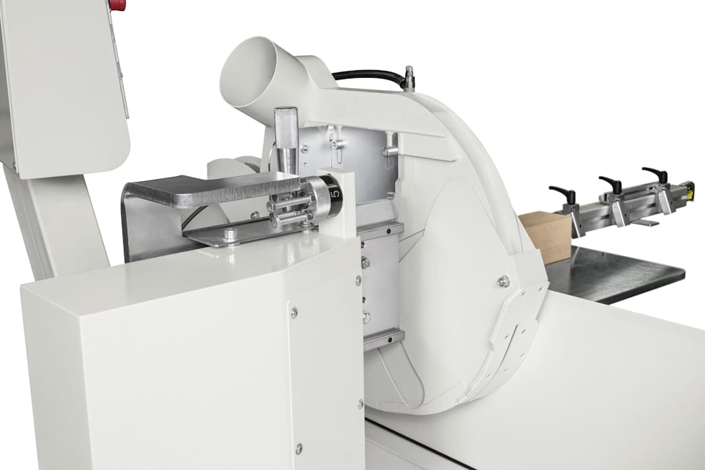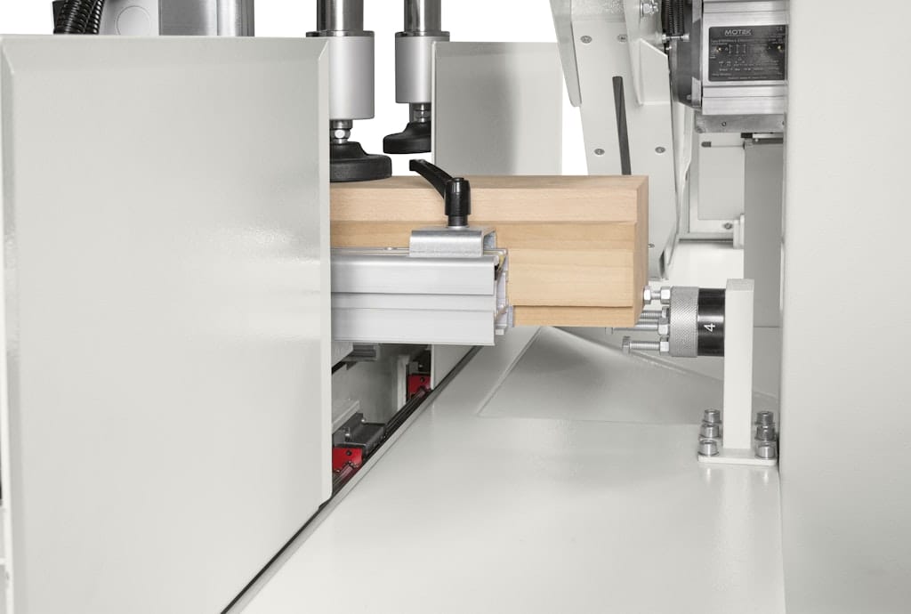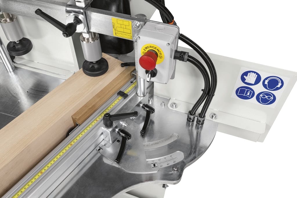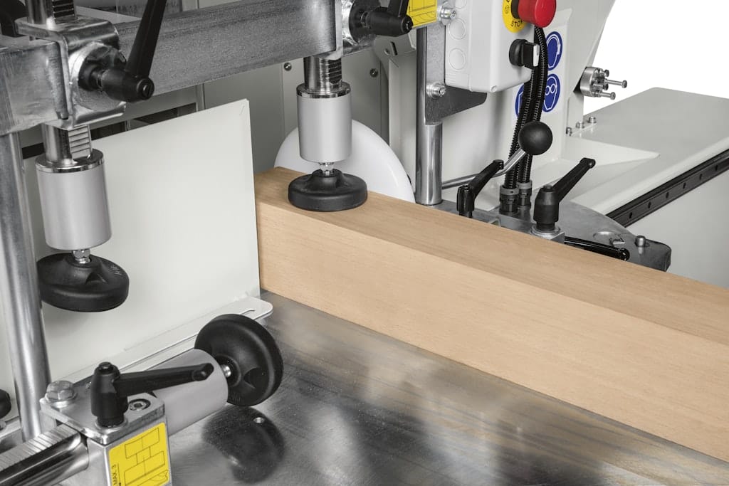 This automatic tenoning machine offers exceptional speed and precision for professional workshops. Its two vertical and one horizontal pressure cylinders securely lock workpieces for accurate machining. Ideal for efficiently handling large and complex elements with consistent results.