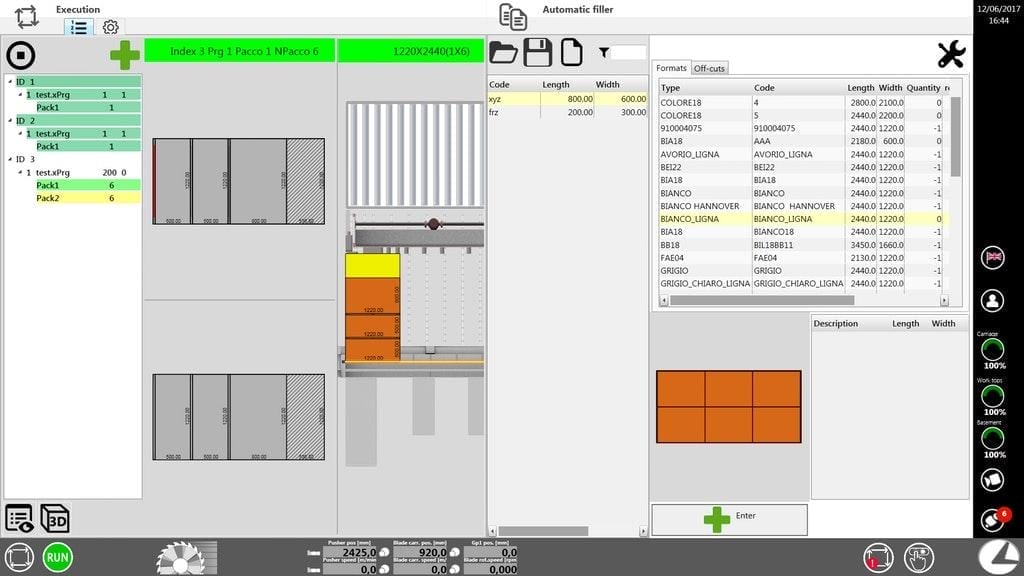 Each table section has an air-blowing device that can be enabled/disabled via independent motors, ensuring that the sliding of panels is free of errors and the accidental falling of cut panels. Additionally, tool changing has been greatly simplified and can be executed swiftly thanks to the “saw-set”. The electronic settings allow for fast and precise tool adjustments – boosting both ease of use and productivity.