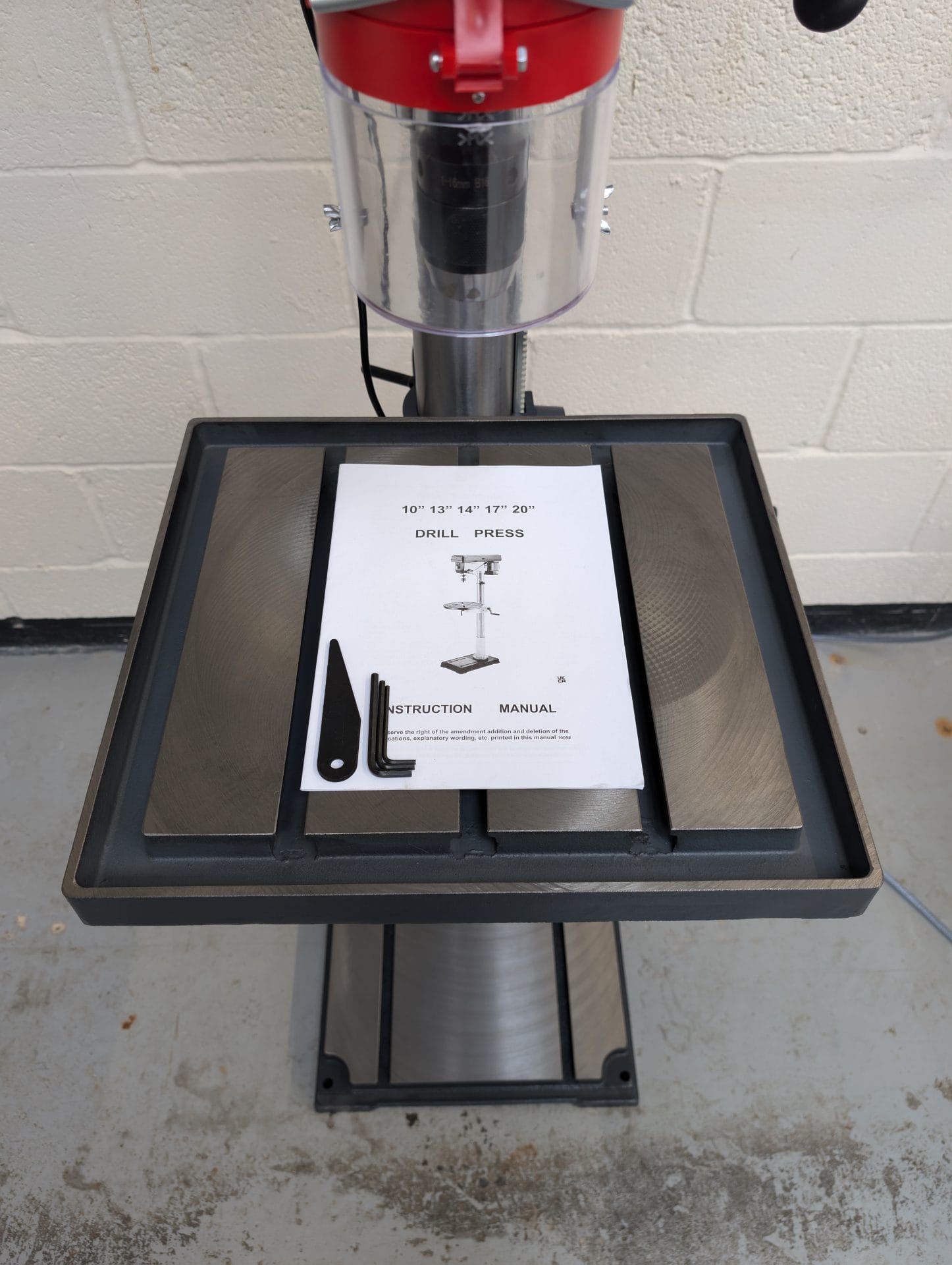 The machine is built around a heavy cast iron frame, including the base, column and table, which provides excellent stability during operation. This rigidity helps reduce vibration and ensures accurate drilling, particularly when working with larger drill bits or harder materials. A powerful 2 hp motor drives the spindle, delivering consistent performance even under load.