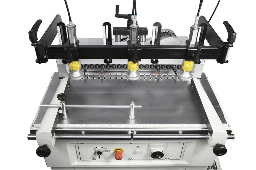 Guaranteeing the absence of disruptive vibrations, the drilling head is made from single-piece aluminium casting. Stability and precision are also assured thanks to the two rectified cylindrical guides on which the boring machine runs. The mechanical revolver has a range of 5 differing boring depth adjustments for flexible working and the new dust extraction system has a great emphasis on efficiency – making for a cleaner, healthier working environment.