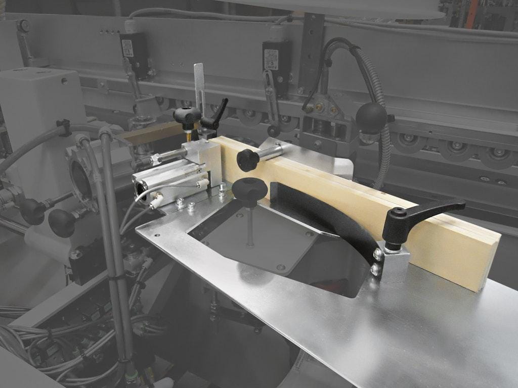It is installed in place of the standard end cutting unit, during the process of cutting of the front and rear exceeding edge; it rounds-off the angles of the edge banded panel carrying out a radiused edge.