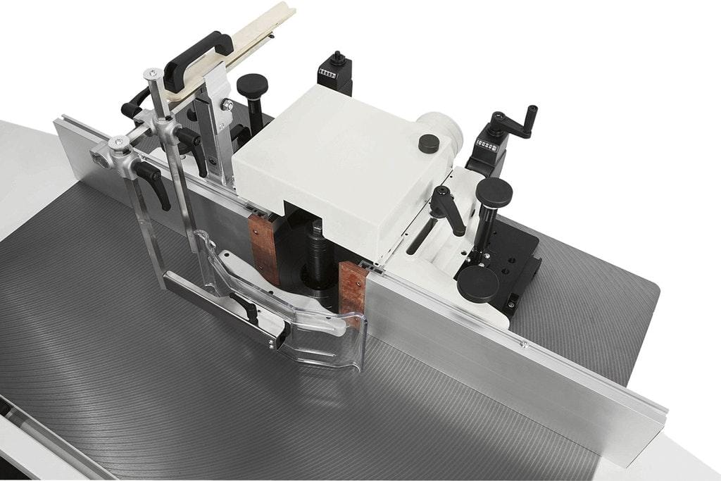 All adjustments are made from the front of the machine using hand wheels with mechanical readouts, allowing precise positioning without the need for repeated test cuts. The spindle moulder fence features mechanical programming with digital-style readouts, enabling accurate setup down to a tenth of a millimetre and improving repeatability across jobs.