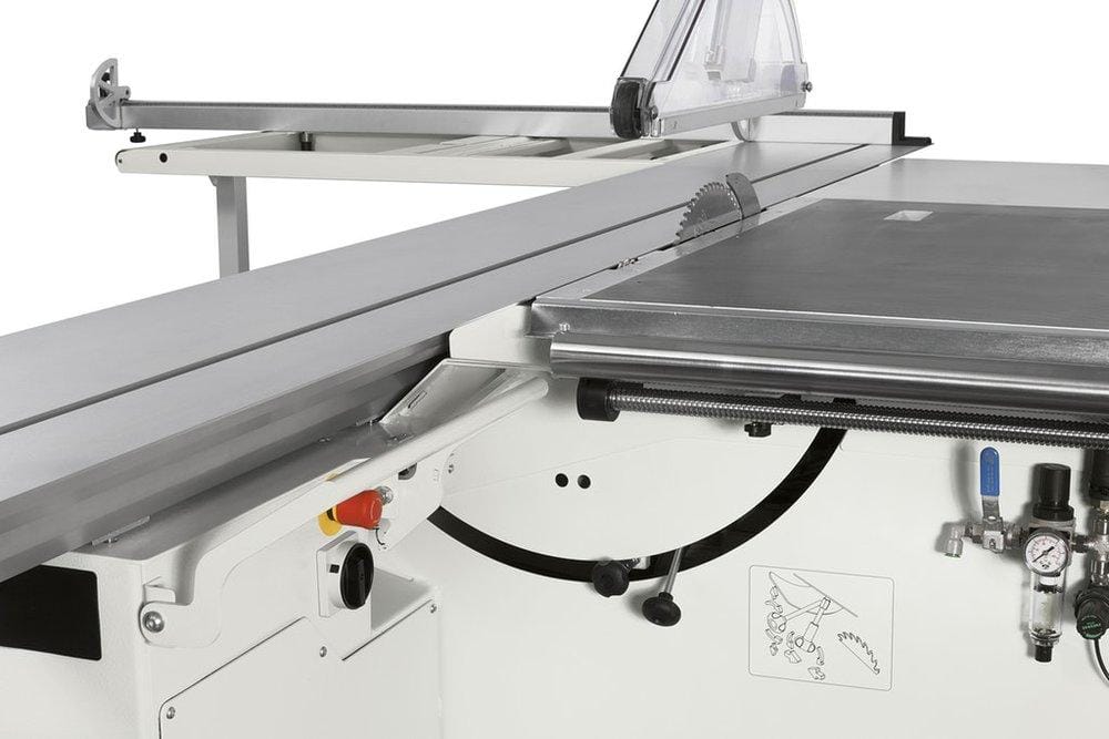 For ease of use and ergonomics, this panel saw features a manual lifting and tilting function for the saw unit, all located on the operator’s side of the machine. The mechanical readout for the saw tilt makes for excellent precision when cutting and also makes for easy, simple cutting.