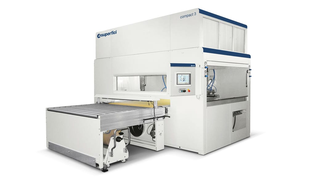One of the standout features of the Compact 3 HY is its hybrid conveying system, which offers operational versatility. Depending on production needs, it can function with a paper protection system—ideal for small batch productions—or with a self-cleaning belt system equipped with a lacquer recovery and cleaning unit, suitable for larger production runs.