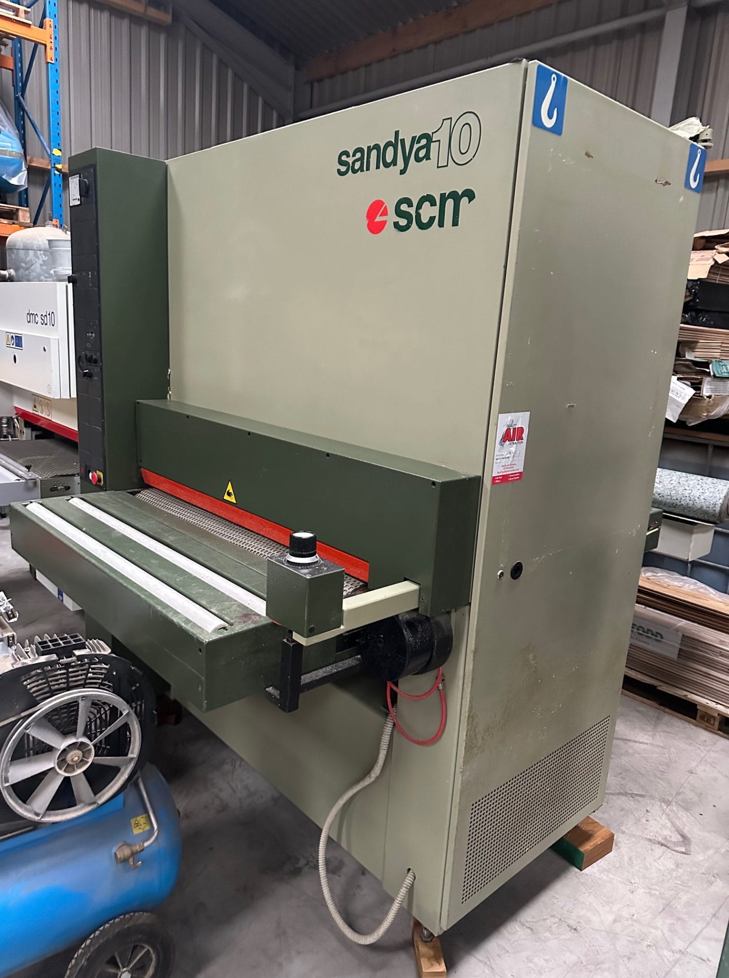 With a working width of 1100 mm and a thickness capacity of up to around 160 mm, the Sandya 10 is well suited to handling both large panels and smaller components. The conveyor feed system moves material through the machine at controlled speeds, ensuring even sanding pressure and consistent results across the full width of the workpiece.